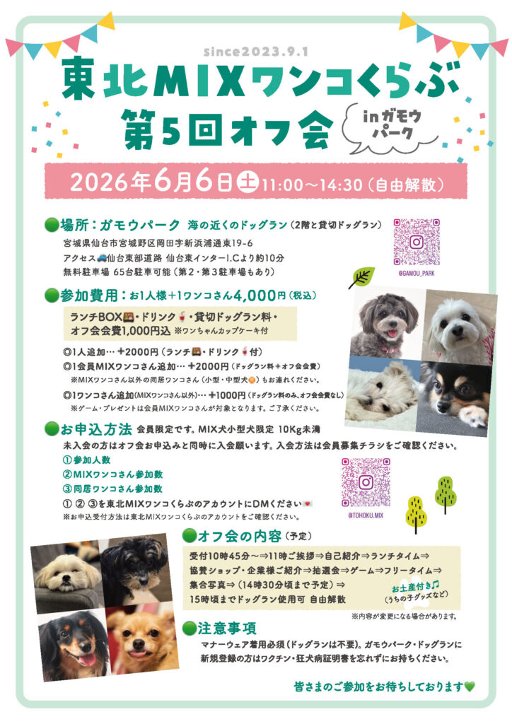 『東北MIXワンコくらぶ』は、常日頃、集いがとても少なく、集まる場所もなかなかないMIXワンコさんのため。そして、「東北のMIXワンコさんとつながりたい」「つなげていきたい」という飼い主様の想いから、2023年の9月1日、宮城在住のメンバーにより発足しました。 おかげさまで会員様が増え、青森から福島にわたり184ワンコさんとつながっています。 年に2回、春と秋に開催しているオフ会も、第5回を開催することとなりました。1回目から4回目までの経験を活かし、ますます多くのMIXワンコさんたちと集いたいと思っております。