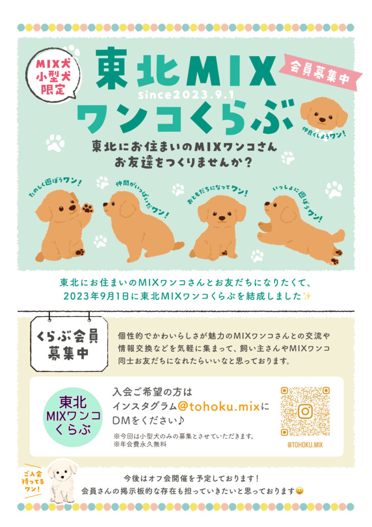 ★参加お申込は4月18日(土)20時〜 @tohoku.mixのインスタで受付を開始します★ 『東北MIXワンコくらぶ』は会員募集中です。東北にお住まいのMIXワンコさん、ぜひ!おともだちになりませんか!お知り合いの方にもお誘いいただけますと幸いです。 ★@tohoku.mixのインスタをチェックしてくださいね★