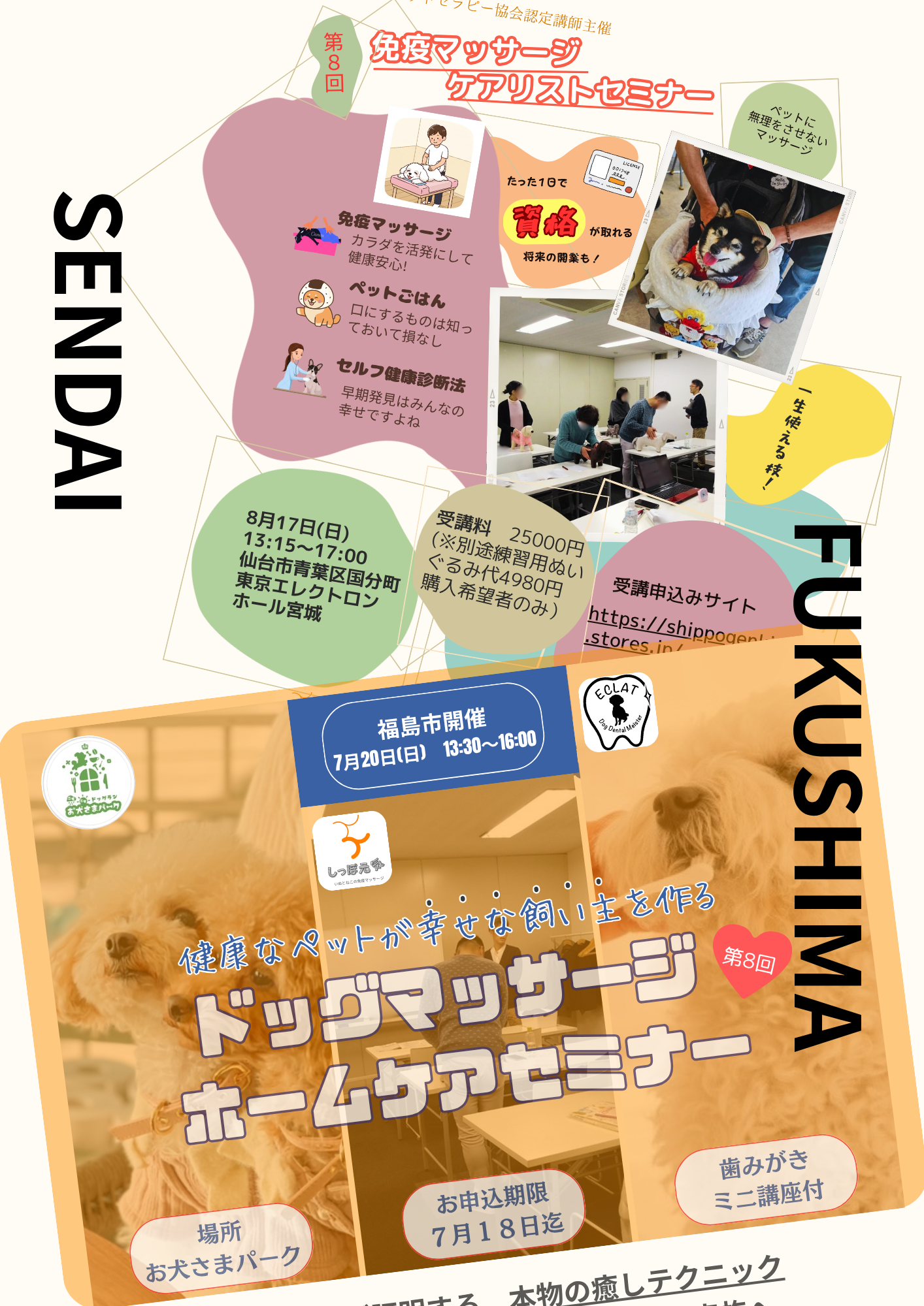 ■某携帯会社CMでおなじみのお父さん犬をマッサージしていた、日本ペットセラピー協会から認定を受けてる講師が主催。詳細は受講申込みサイトからご確認ください。