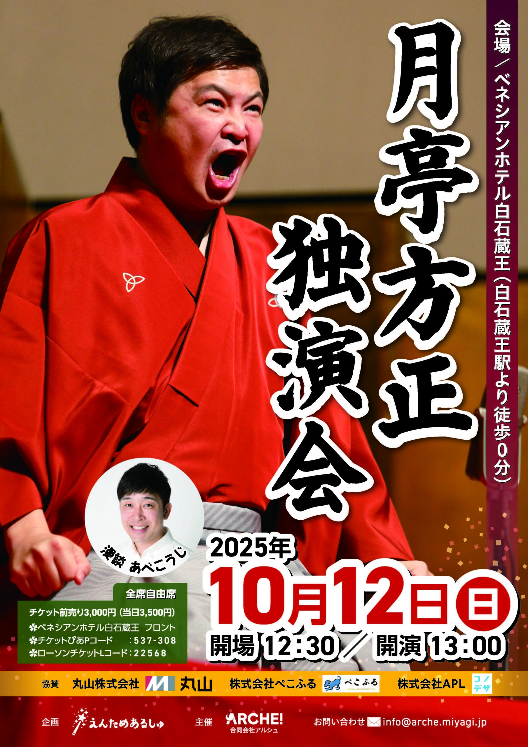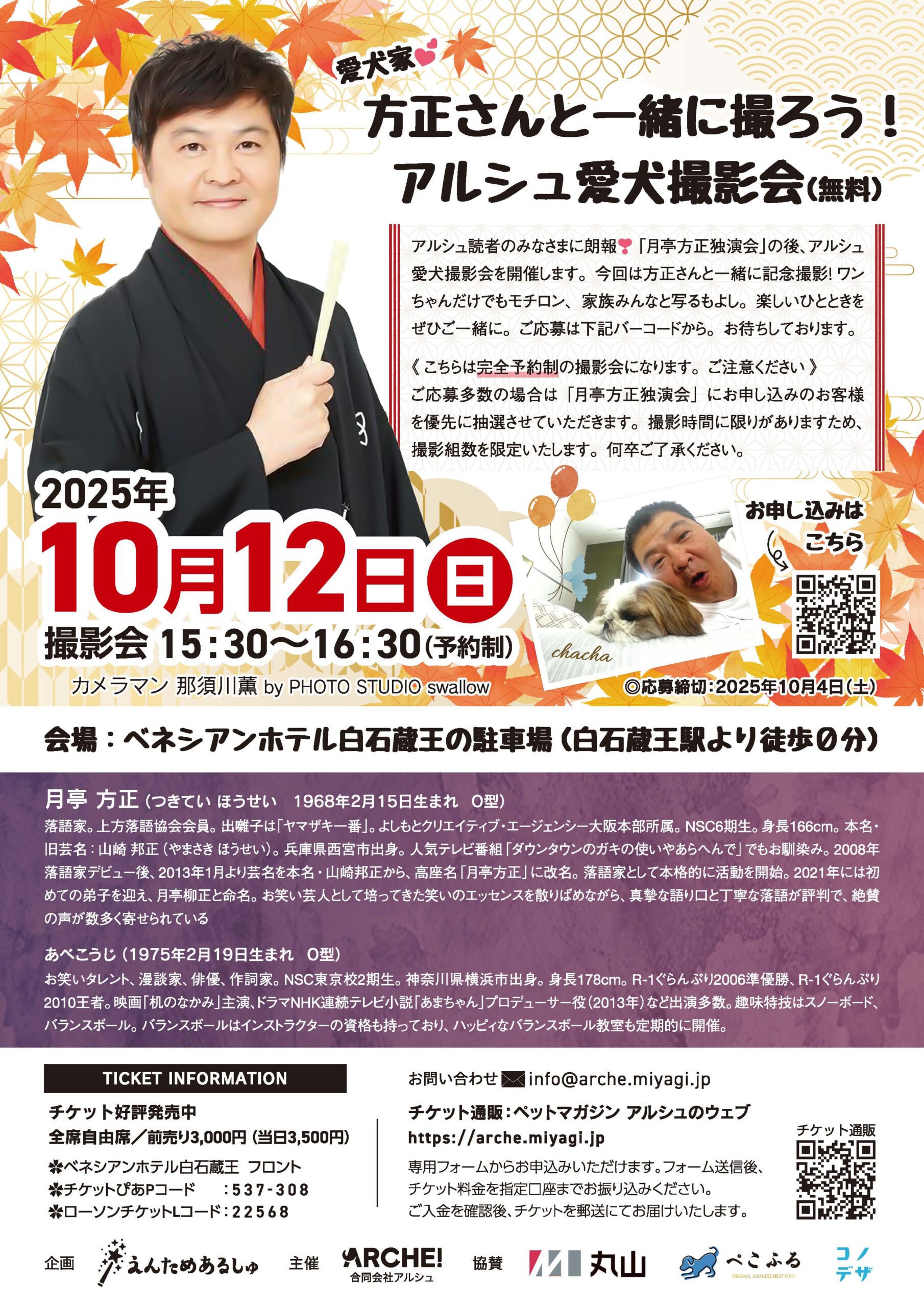「えんためあるしゅ」始動いたします。ペットと一緒に楽しめるイベントを行います。第一回は月亭方正独演会。落語会場にワンちゃんは入れませんが、公演終了後、方正師匠との愛犬撮影会を行います。(予約制です)