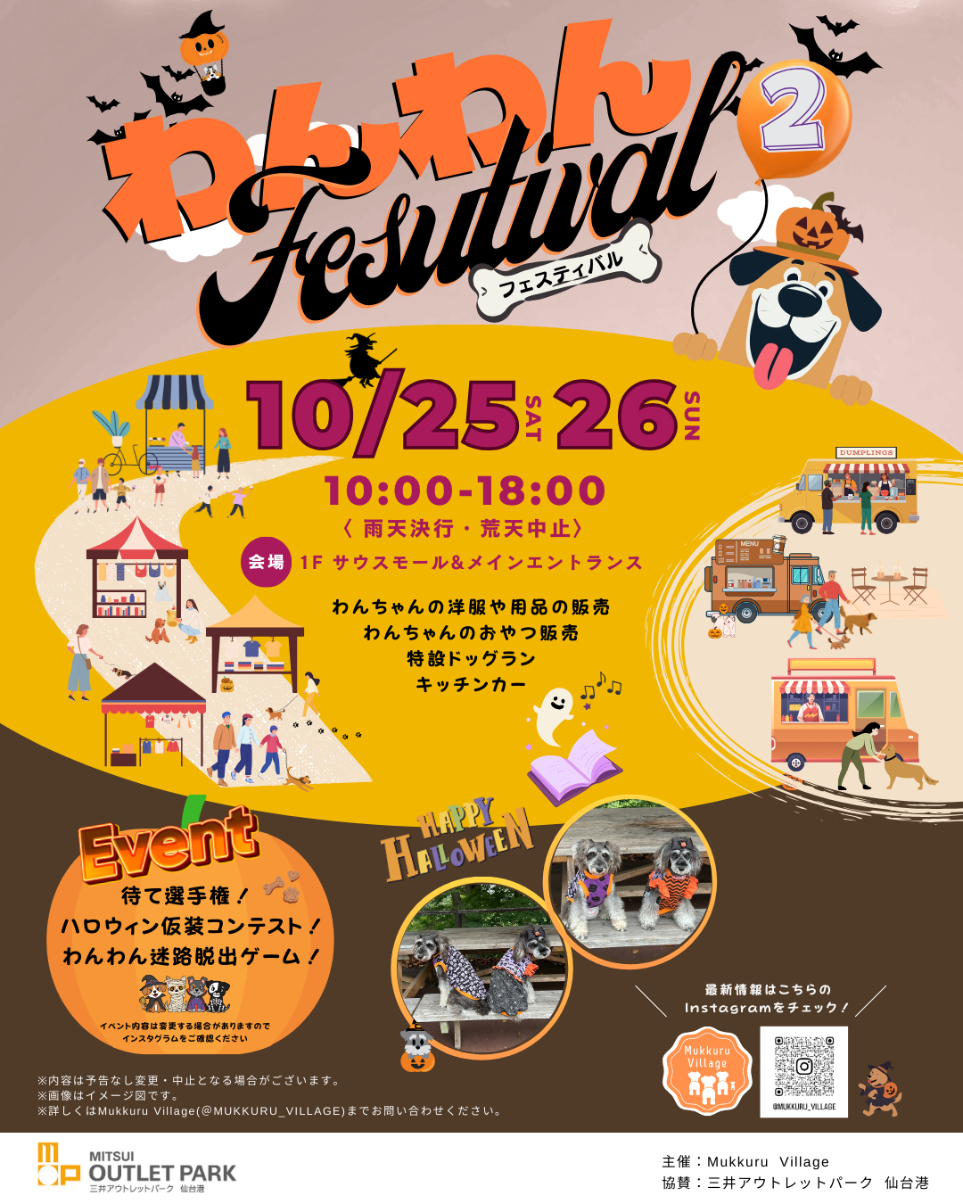 2回目となる『わんわんFestival』が三井アウトレットパーク仙台港の1階サウスモール&メインエントランスで開催決定!わんちゃんのおやつやお洋服、グッズなどの販売やキッチンカーが来るマルシェの他「待て選手権!」「わんわん迷路脱出ゲーム!」など楽しいイベントが満載。「ハロウィン仮装コンテスト!」にどんなオシャレさんが来るのかも気になります。