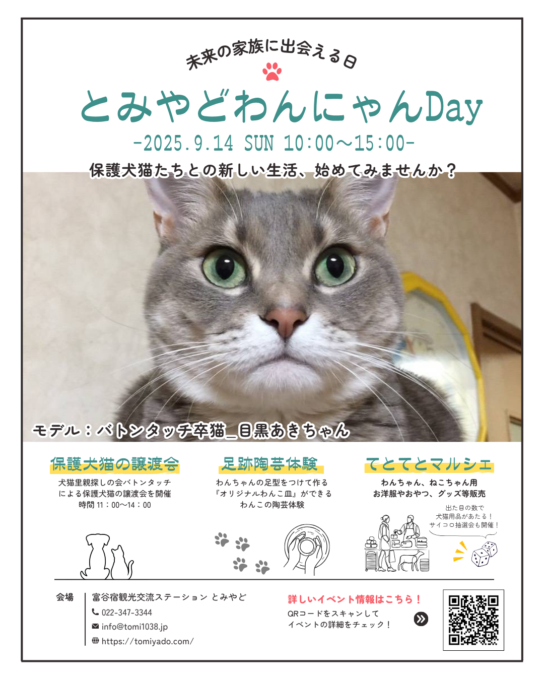 ▼内容 ・里親探しの会バトンタッチによる保護犬猫の譲渡会 ・富谷宿焼くんぷうによるわんちゃん足跡陶芸体験 ・てとてとマルシェ(わんちゃん、ねこちゃん用お洋服やおやつ、グッズ等販売)