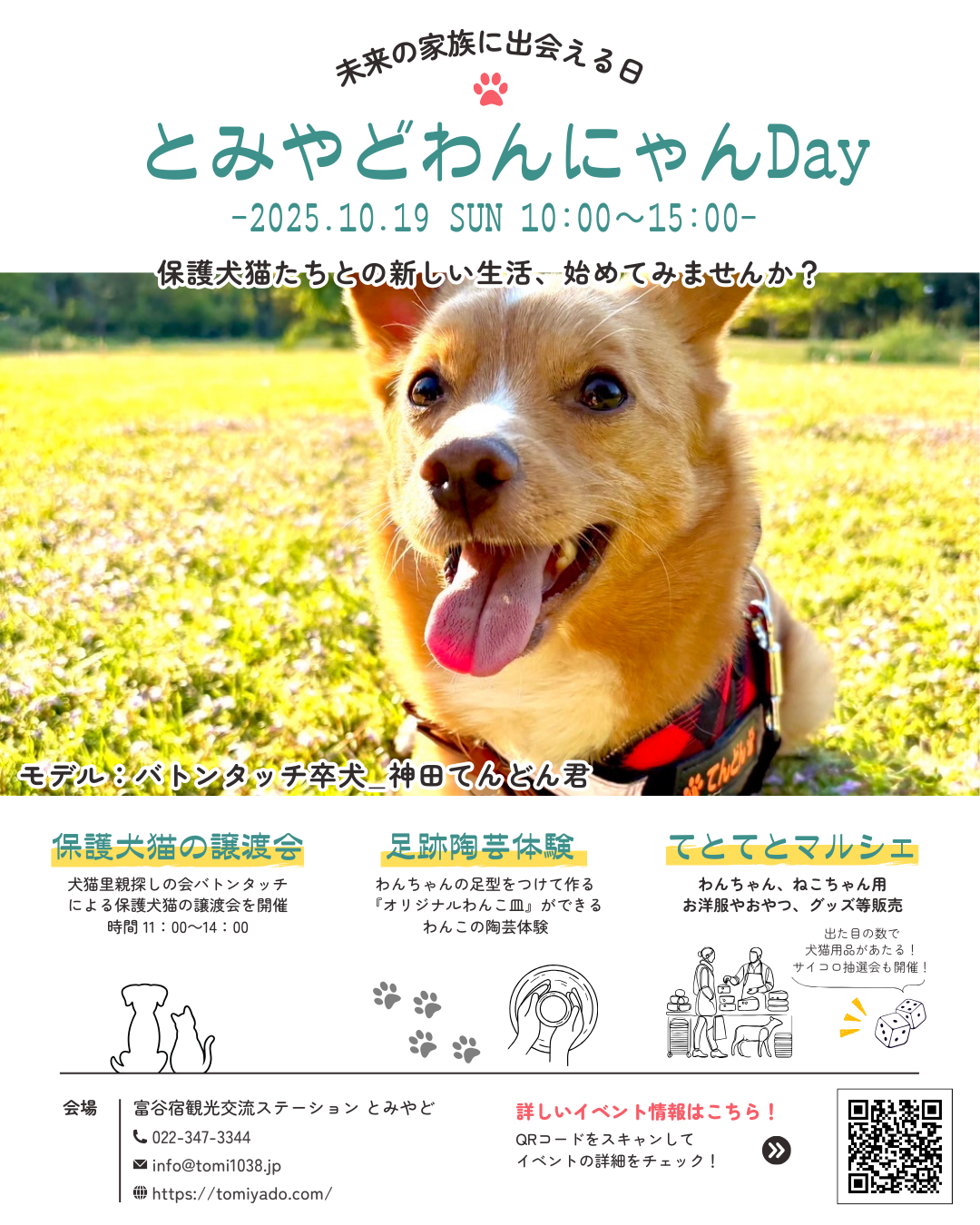 ▼内容 ・里親探しの会バトンタッチによる保護犬猫の譲渡会 ・富谷宿焼くんぷうによるわんちゃん足跡陶芸体験 ・てとてとマルシェ(わんちゃん、ねこちゃん用お洋服やおやつ、グッズ等販売)