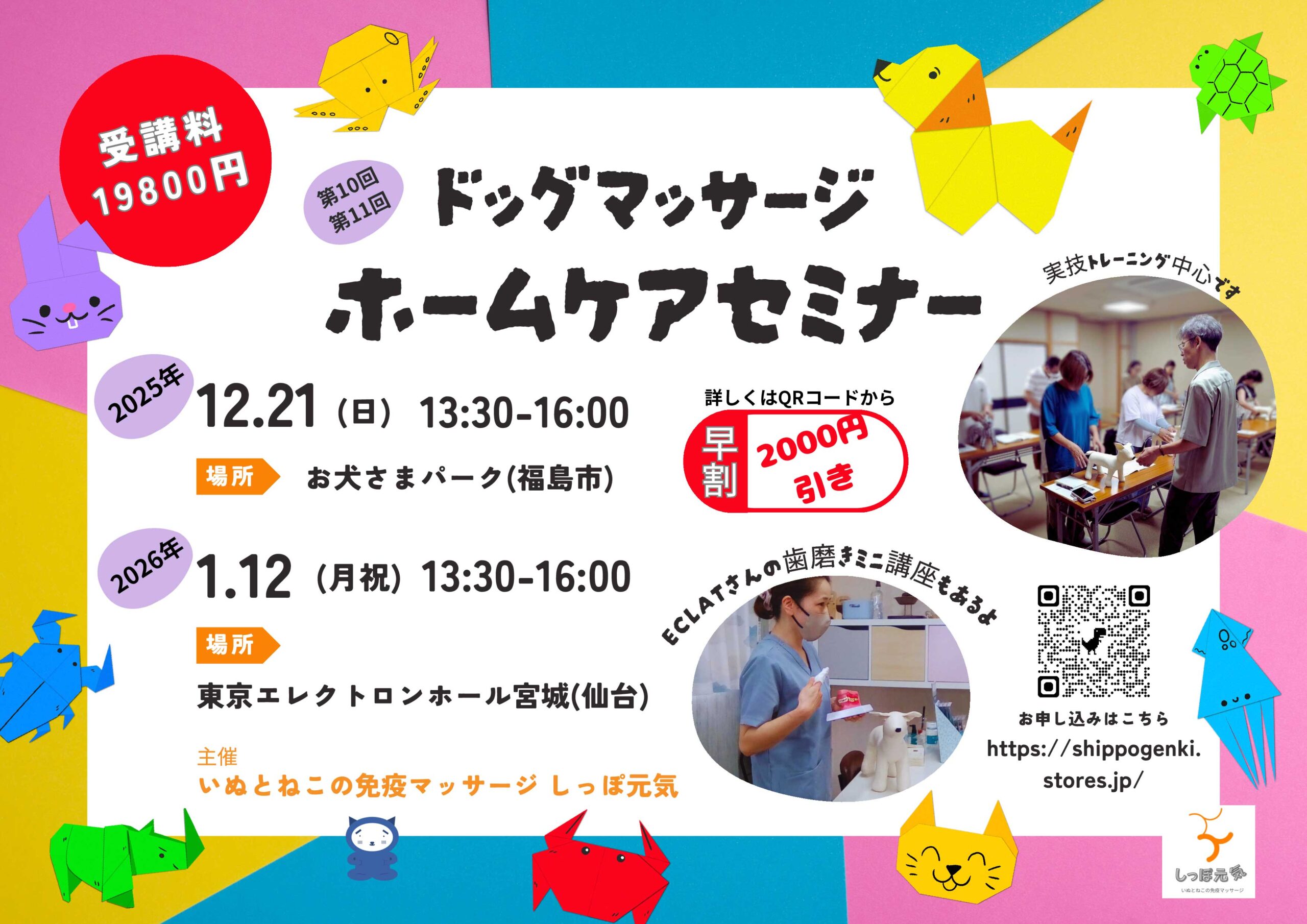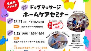 「仙台では2月以来のホームケアセミナー開催! 初心者の方が無理なく覚えられるマッサージ手技メインの内容。今回は福島を拠点に活動されてる、犬の歯磨きレッスンのECLATさんを特別講師に、犬の歯磨き講座を併催。飼い主さんだけでじっくり学べるお得なセミナーです。某携帯会社CMでおなじみのお父さん犬をマッサージしていた、日本ペットセラピー協会認定講師が主催。詳細は受講申込みサイトからご確認ください」
