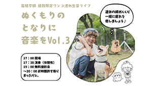 5月6日 @ 17:00 - 20:00 ぬくもりのとなりに音楽を Vol.3 SORA CAFE 〒984-0065 宮城県仙台市若林区土樋8 パルメゾン土樋マンション 103 高橋亨明 組数限定ワンコ連れ生音ライブ「ぬくもりのとなりに音楽をVol.3」 5月6日(水・祝)、仙台SORA […] ¥3000