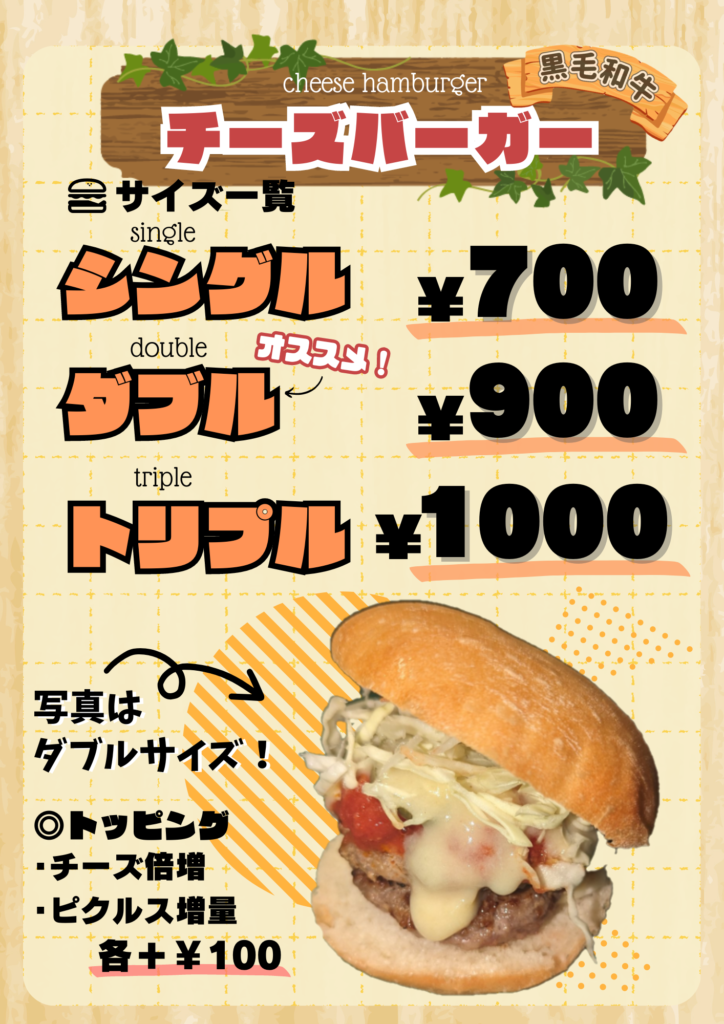 国産の食材にこだわり黒毛和牛と鹿児島黒豚のハンバーガーがメインです。お客様の前で鉄板調理しあたたかい料理を提供致します。是非ご賞味ください。