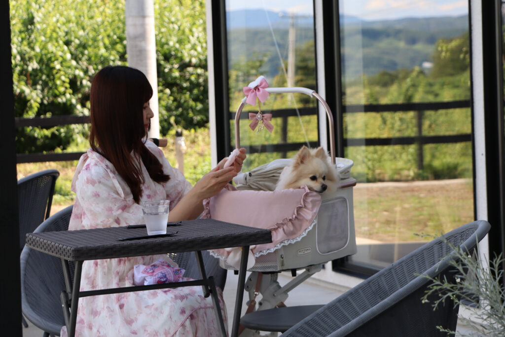 高台にあるこちらのお店にはテラス席が2つあり、ペットと一緒に過ごすことが可能だ。眼下には遠くまで素敵な田園風景が広がっていてペットと共にリラックスした時間を味わえる。残念ながら屋根はないので天気により利用できない日もあるが、午後の時間帯になると建物が日差しを遮ってくれるので過ごしやすくなってくる。