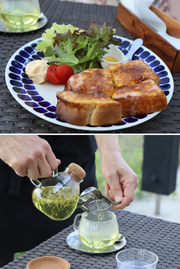 自家製マヨネーズのトースト(上)と蔵王ハーブティ(下)も相性抜群
