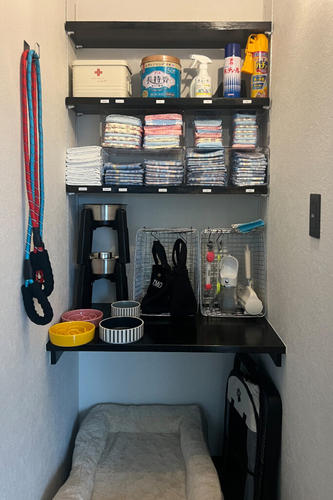 1F ペット(犬)用アメニティーコーナー 各サイズのマナーパンツ、マナーベルトの他、ベッドや食器、お散歩グッズなどが常設