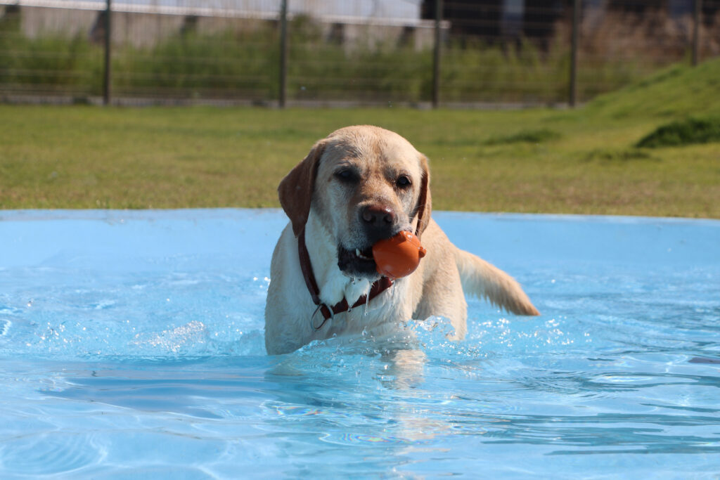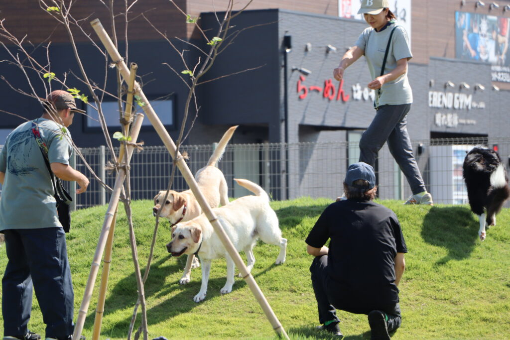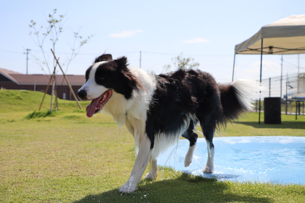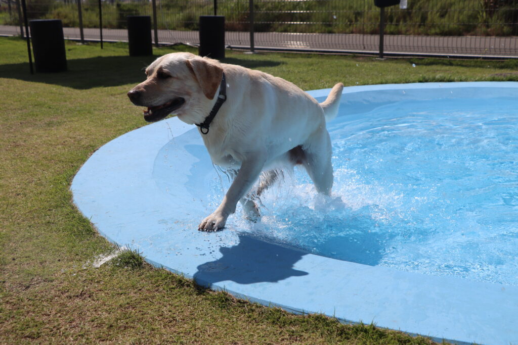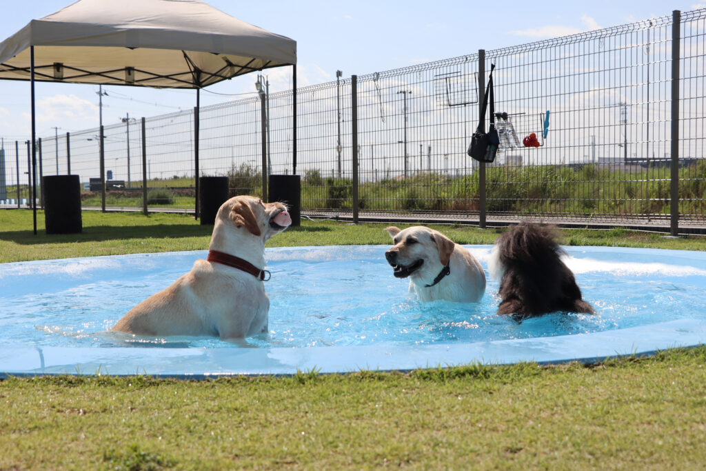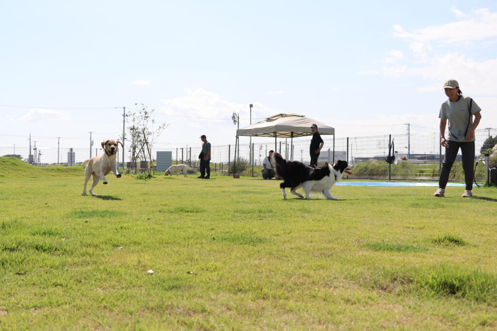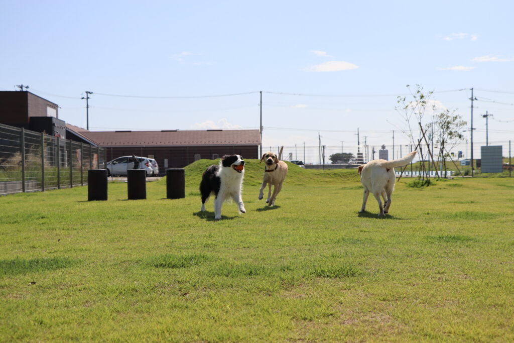 こちらのドッグランは170坪ほどの敷地に深さが2段階になっている犬用プールや小高い丘があり、走り回る犬たちも楽しそう。足元はフカフカの天然芝で強い日差しを受けても安全な温度を保ってくれている。暑い中元気よく走り回っても犬たちがバテないのはこの天然芝と自由に入れるプール、そしてすぐそばの閖上の海から吹いてくる海風のおかげのようだ。これならもう少し早く訪れても大丈夫だったかもしれないな。