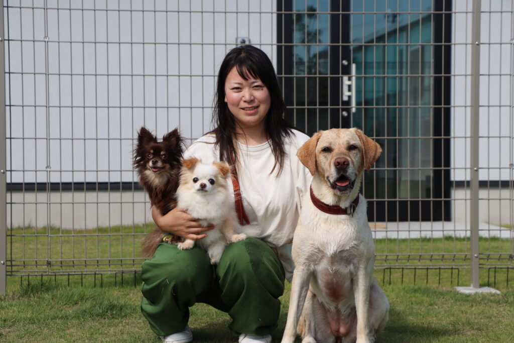 オーナーの裕美さんと愛犬のこまめちゃん・モコちゃん・びきちゃん 「平日は貸切りランができるので、他の犬が苦手なわんちゃんも思いっきり楽しめます。またパピー犬の社会化や老犬のお散歩などそれぞれのわんちゃんに寄り添った使い方ができるドッグランです。ご家族やお友達とぜひお越しください」