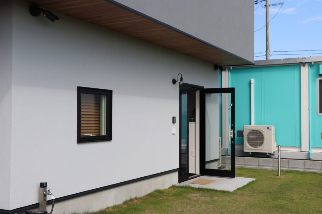 奥のグレーの建物が事務所