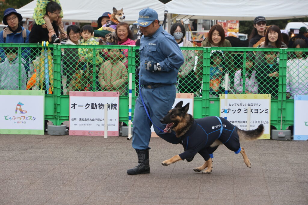 警察犬・災害救助犬の実演では、訓練された犬たちが指示に従って機敏に動く姿が披露!