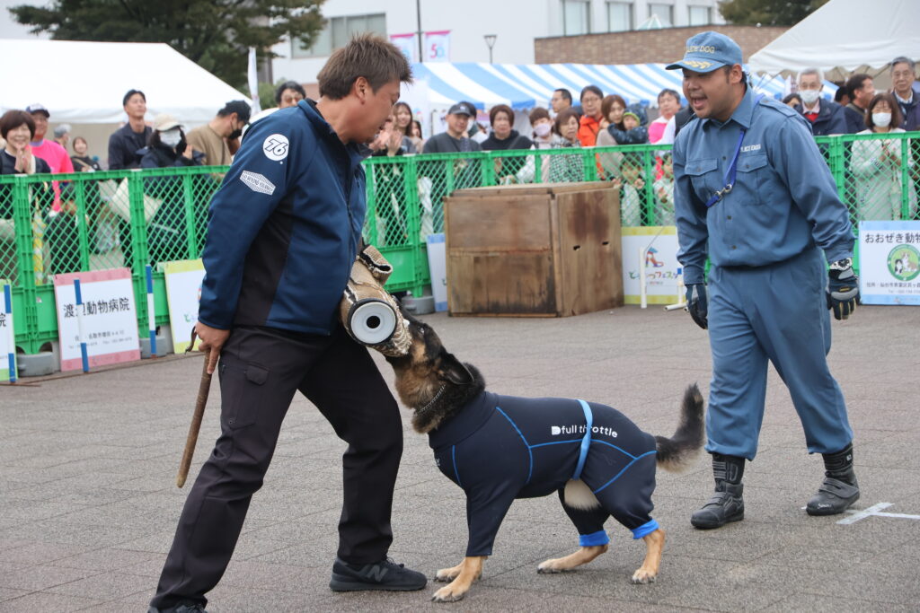 警察犬が犯人を捕まえる迫力ある様子や災害救助犬が箱の中にいる人を嗅ぎつける様子に観客からは感嘆の声があがり、子どもたちも身を乗り出して見入っていた。