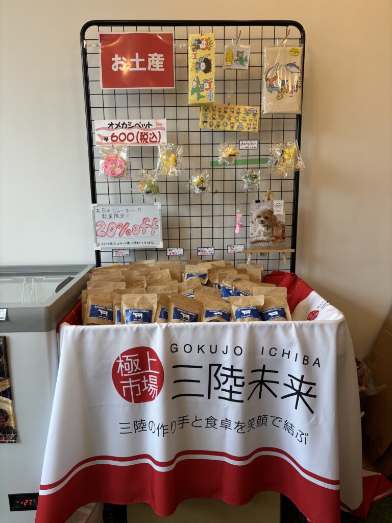 こちらのお店は漁師や水産加工会社の社長が集まり作った会社「株式会社さんりくみらい」が運営している。普段は消費者と接しない1次加工の専門家たちが直接消費者に届けたいと作ったお店だ。販売している商品は加工段階で使用されなかった未利用部分を、国産無添加のペットフードを手掛けている鹿児島のN FOOD SERVICEによりペットフードとしてよみがえらせたもの。まさにSDGsなペットフードだ。