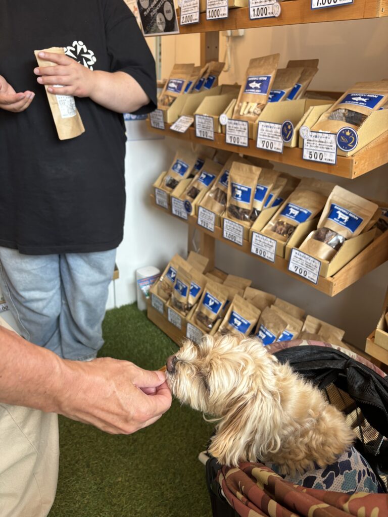 店舗には常時50~60種ほどの犬と猫のペットフード(おやつ)が用意されている。気仙沼のサメやまぐろ、鮭、シイラなどの魚の他に国産の牛、豚、鶏、馬などのお肉を使用したジャーキー、ペースト、テリーヌなどがあり、中型犬、大型犬でも満足できる噛み応えのある物から小型犬が喜ぶ小さめで柔らかいものまで多種多様。特に気になったのは気仙沼らしく高級食材のフカヒレを使ったフカヒレジャーキー。贅沢で栄養価の高いおやつとして人気のようだ。どれがいいか悩んだら試食もOKだ。実際に愛犬、愛猫と店内に入ることができ、気になる商品を試食させてもらえるので「一か八か気に入るか分からないけど買って行ってみよう」なんてギャンブルをする必要がないのは飼い主にとってかなり嬉しい。しかも毎月11日・22日はワンワンの日・ニャンニャンの日ということで、各商品10%OFF。当日が定休日の場合はその前後の2日間がワンワンの日・ニャンニャンの日となる。さらにこの時期ミライショップでは、購入者にペット用かき氷をプレゼント。気仙沼で採れた冷凍いちごを削ってトッピングしたふわふわのかき氷だ。