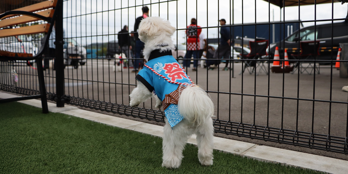 それではここからが本番です。花火をバックに…の撮影はできませんでしたが、さんぽさんが用意してくれた素敵なお祭りディスプレイの前でパシャリ。今回もたくさんのわんちゃんの素敵な写真がいっぱいです。