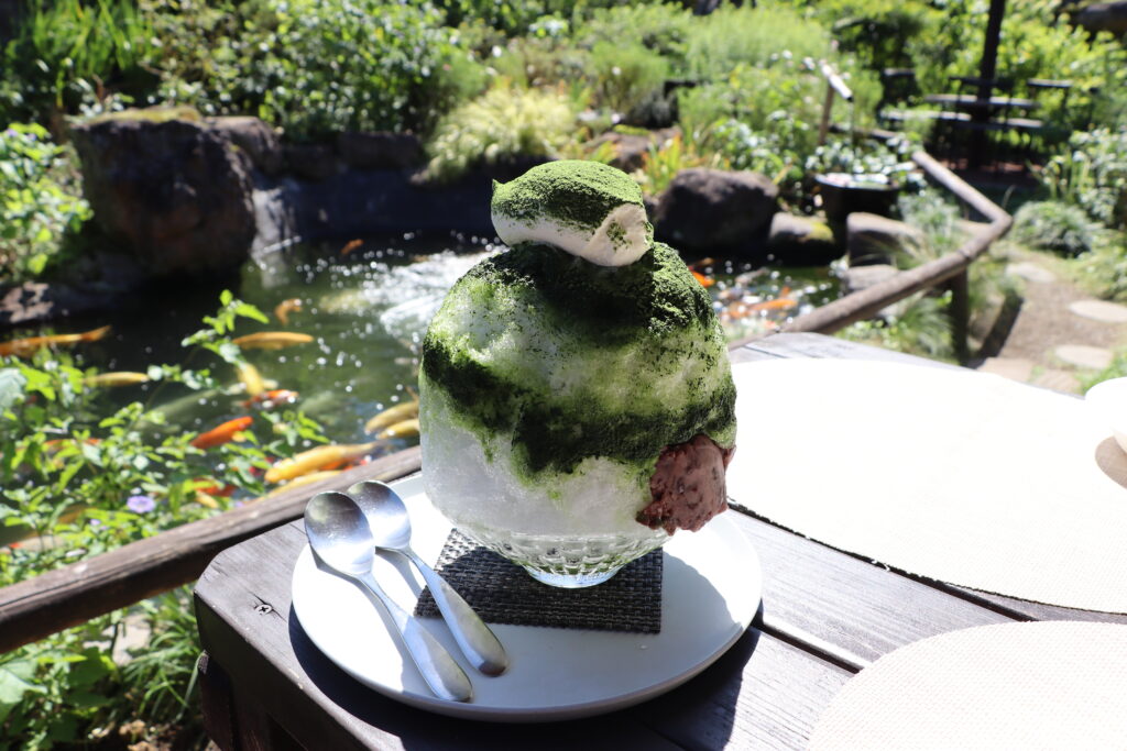 ほどなくして今度は人間用のかき氷が運ばれてきた。真ん丸の大きなかき氷。今回用意してもらった「河越抹茶氷」は埼玉県川越市の高級抹茶を使用したシロップがたっぷりとかけられている。他にもいちごやあんず、ほうじ茶など色々な味のかき氷があるのだが、これらのシロップは全て自家製なのだそうだ。かき氷の上にはぽってりとした生乳100%のフレッシュな生クリームがトッピングされており、香りのよい抹茶のかき氷と風味豊かなコクのある生クリームがとても良い相性だ。更に下の方に顔をだしている優しい味のあんことの合わせ技で奥深い味わいが楽しめる。