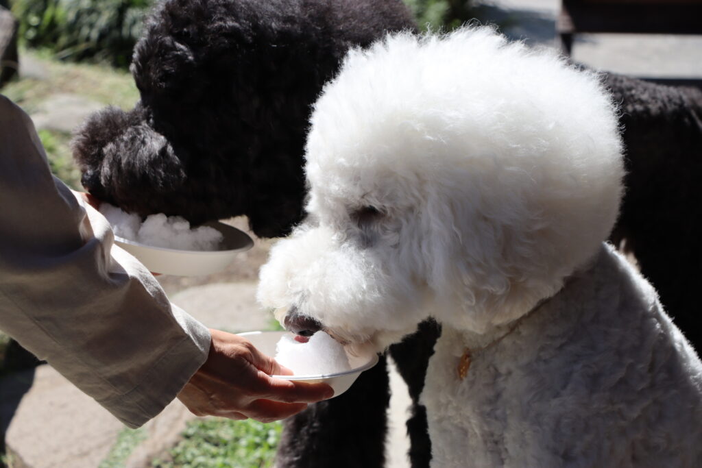 見事な鯉の姿に見入っていると先にわんこ用かき氷が運ばれてきた。フワフワの氷。味はもちろんついていない。かき氷を食べるのは初めてだという風ちゃん雷ちゃんの前にそれを出すとなんの躊躇もなくバクバク食べ始めた。そしてあっという間に完食。飼い主であるたまねぎさんも風ちゃん雷ちゃんの様子に驚いていた。