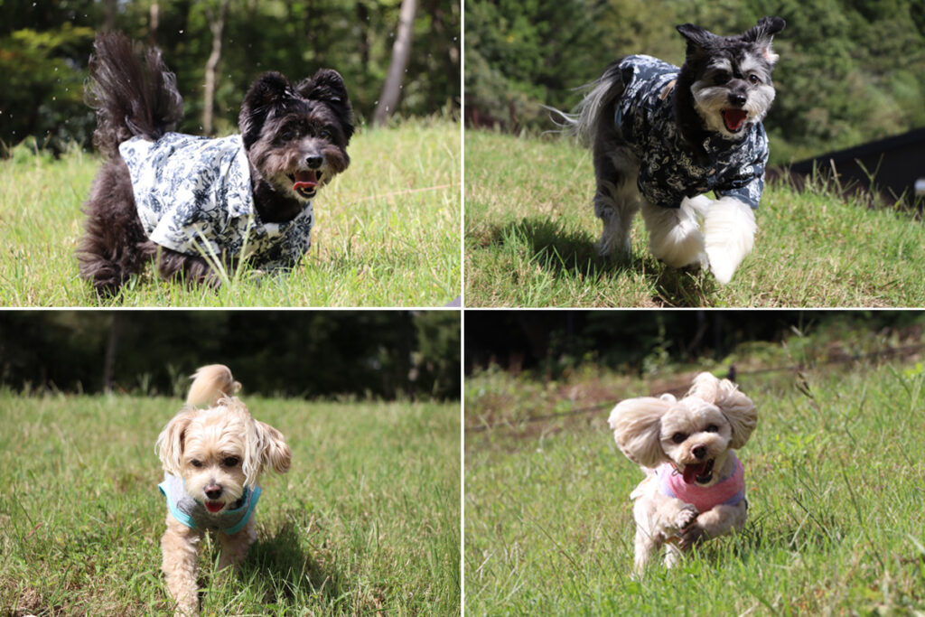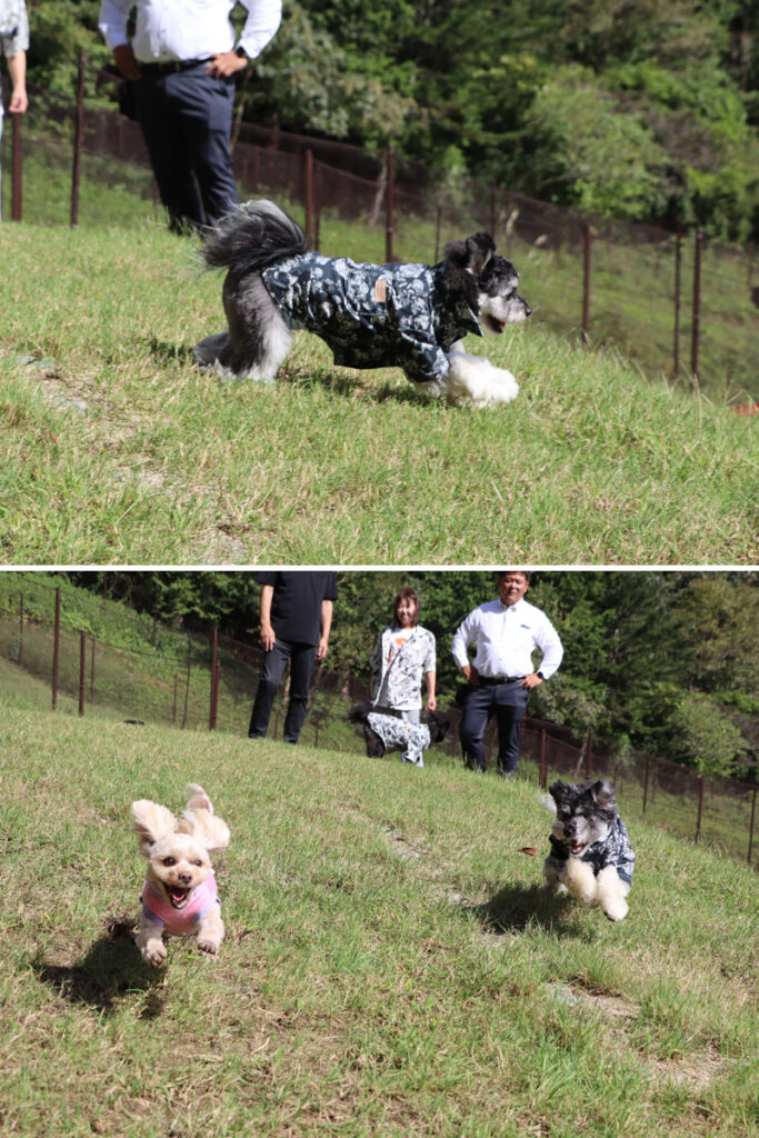 飼い主たちの驚きをよそに、一番最初に走り出したのはおにぎりくん。そしてそれにつられて愛犬2号も走り出した。2匹は楽しくて仕方がないご様子。斜面になっていてもお構いなしのようだ。けだまくんと愛犬1号のお兄ちゃんコンビは少し様子を見ていたがそのうちテンポよく歩き出した。自然の中で自由に動けるのが楽しそうだ。