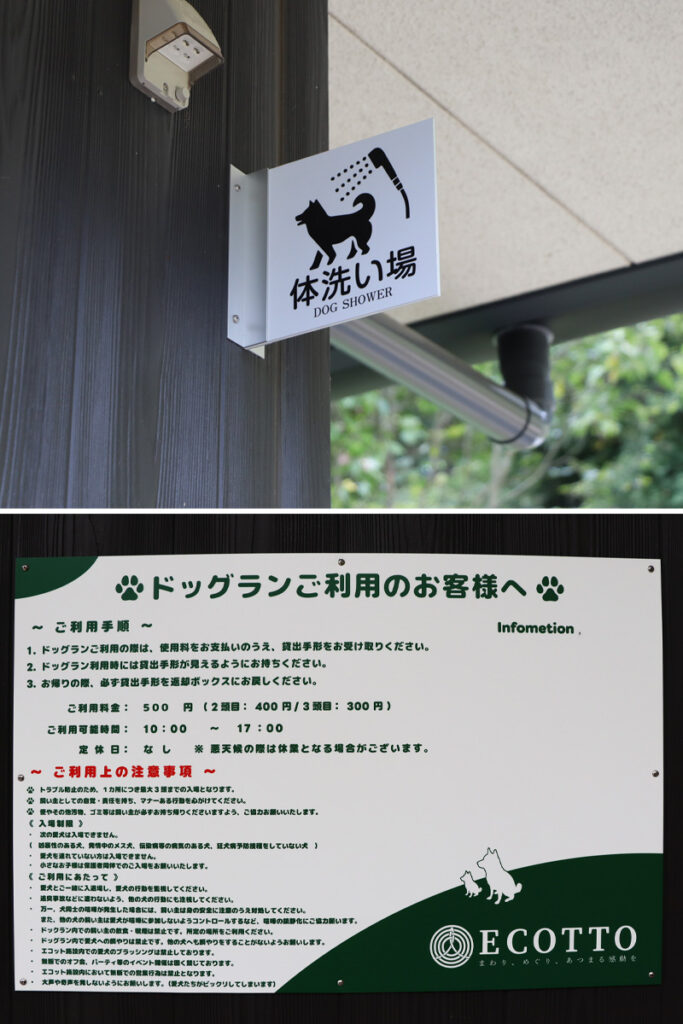 下の建物にはわんこ用足洗い場とシャワーを設置(上)利用する前にご一読ください(下)