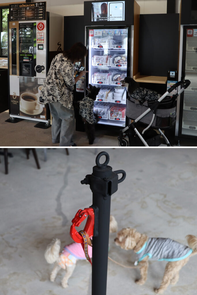 ひとしきりドッグランを楽しんだ後、下にある建物の中を覗いてみた。ここは誰でも利用できる「セルフカフェ」になるそうだ。もちろんわんこと一緒に入店可能だ。まだ工事中だったがすでに飲み物と食事の自動販売機が置いてあり、オープンまでには「わんぴーす」のわんちゃんごはんやおやつなども購入できるようになるそうだ。またここにある自動販売機を利用して、ドッグランの貸出手形も購入できるようにするらしい。支払いは全てキャッシュレス。アプリを入れてそれを使って購入するようになっている。気になるドッグランの利用料は1日遊べて500円。2頭目400円、3頭目は300円とかなりリーズナブルだ。ドッグランで遊んでセルフカフェでお昼を食べて、少し休憩したらまたドッグランで遊ぶというのももちろんOK !