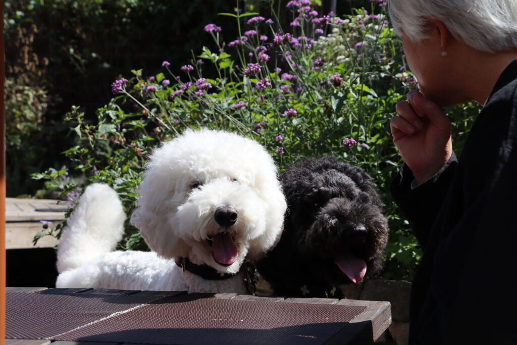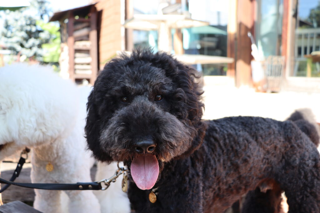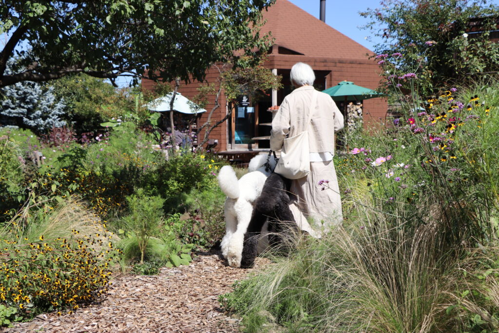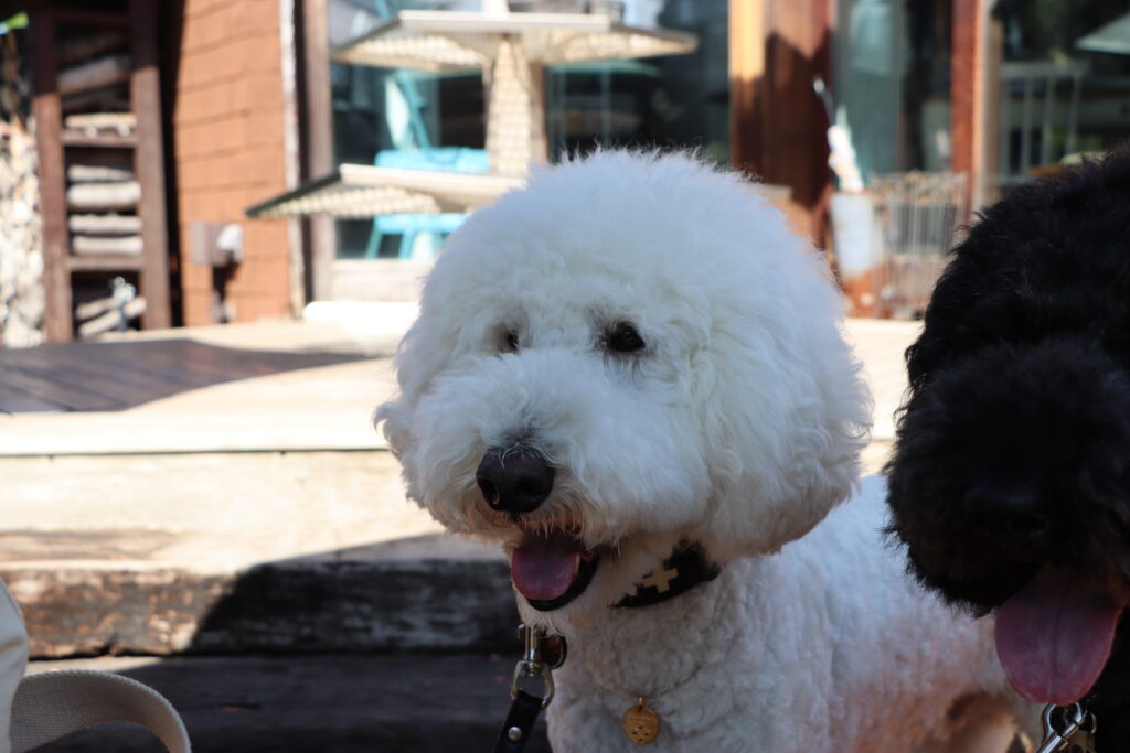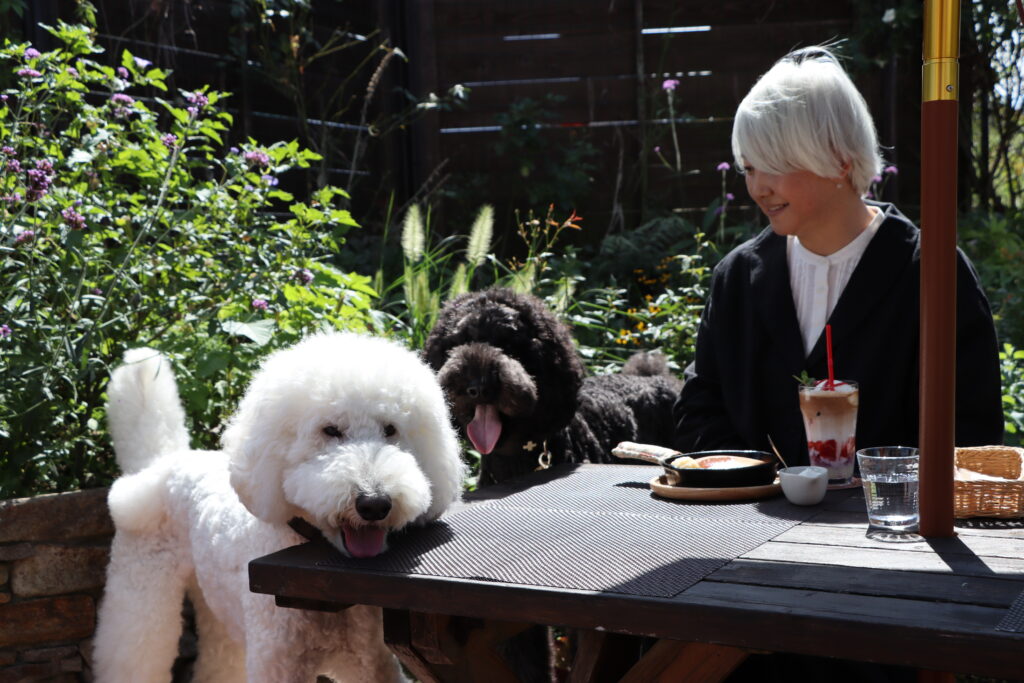 後日改めてスタンダードプードルの風ちゃん雷ちゃん、そしてたまねぎさん(@tamanegi.qoo.riku) にお付き合いいただきこの「ミツバチガーデンカフェ」へお邪魔してきた。この日も秋晴れの空が気持ちいい。