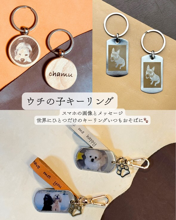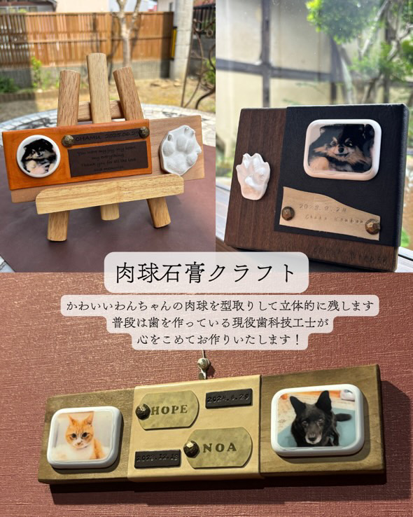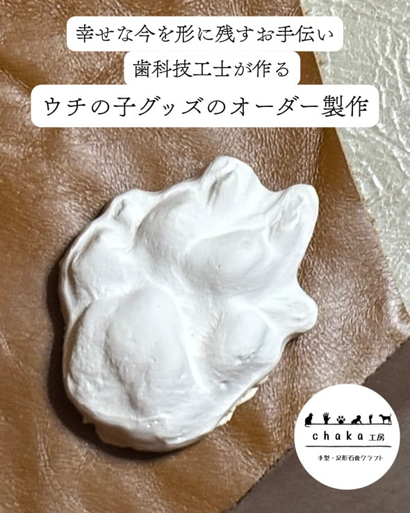 chaka工房では、大切な家族であるわんちゃんの“肉球”を型取りして作る肉球石膏クラフトや、お気に入りの写真から作る名前入りキーリングなど、オーダーメイドで心を込めてお作りしています。