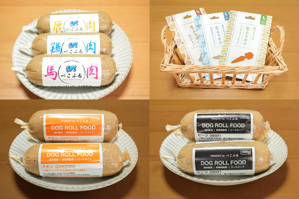 ぺこふる最初の商品は「鶏肉」「馬肉」「鹿肉」の冷凍ロールフード3種だった。どれも東北産100%でネット販売がメインとなった。広く知ってもらうため、イベントなどに出店し、諒さん自ら商品のPRを行いつつ、飼い主から愛犬の食に関する悩みなど、多くの生の声を聞いた。そしてその声を元にさらに商品開発を進め、現在は冷凍の「羊肉」や冷蔵の「ビーフ」のロールフードのほか、細かくしていつも食べているドライフードにトッピングできる生ふりかけの「仙台牛タン」なども追加販売している。さらに2月には冷蔵のロールフード「チキン」と生ふりかけの「岩手県産雪っ子にんじん」「気仙沼産ヨシキリザメ」も販売するなどかなりラインナップが充実する。