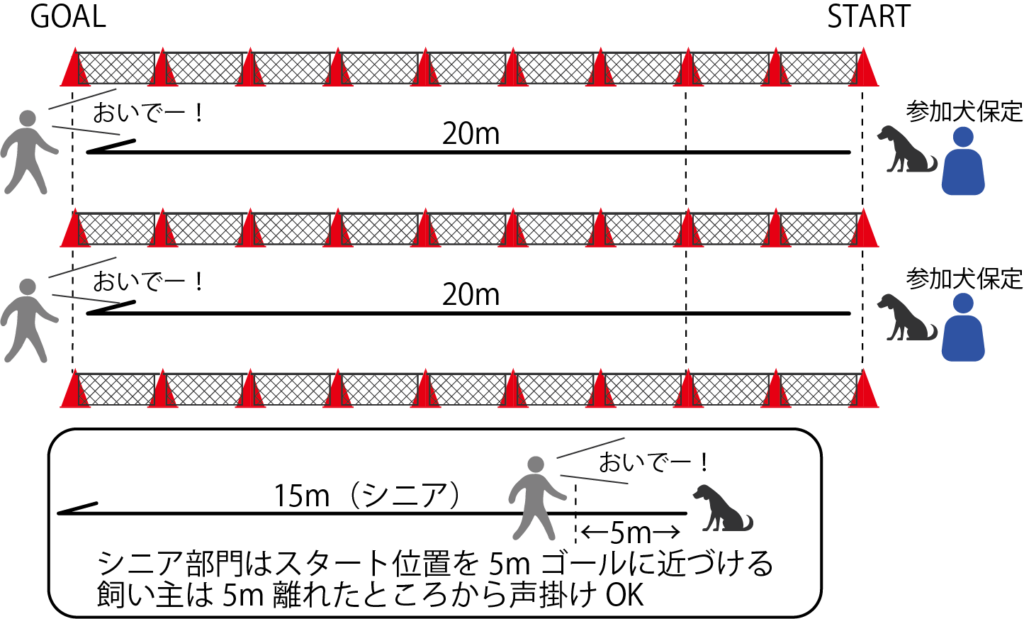 - 保定を確認したら飼い主さんはリードをもって急いでゴールへ移動してください。この時シニアの部の飼い主さんはスタート地点から5m先でスタンバイして、ゴールまで一緒に走ってもOKです。