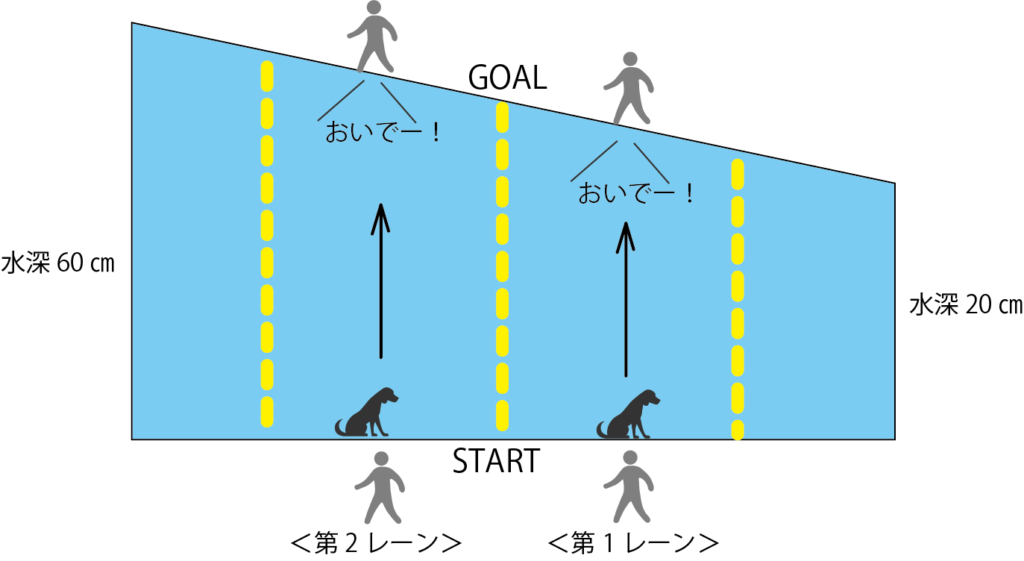 - スタートの合図で手を放したら飼い主はゴールへ移動しながら誘導。その際プールの中、外どちらを通ってもかまいません。