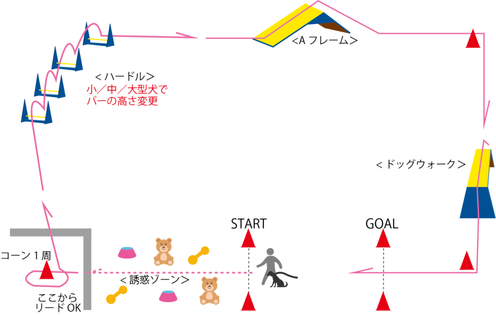 - 「誘惑ゾーン」「コーン1周」をクリアした後、「ハードル」「Aフレーム」「ドッグウォーク」などのアジリティをクリアしながらゴールを目指すタイムレースです。